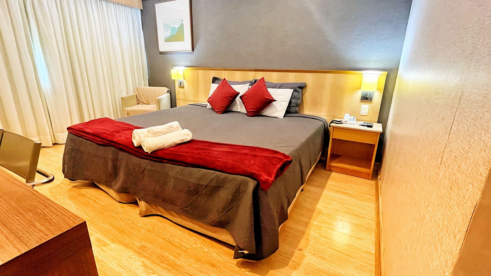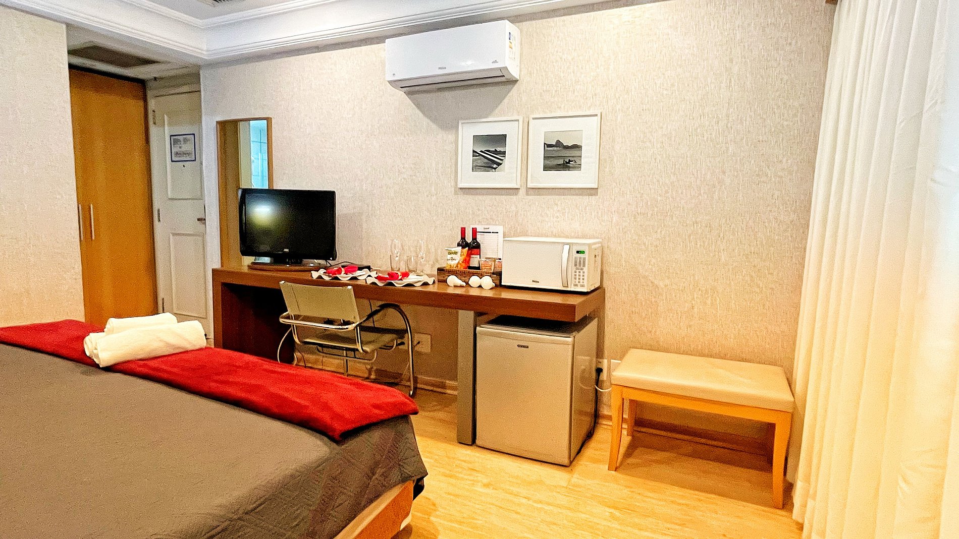 - No apartamento você terá ampla cama de casal King Size que pode se tornar 2 camas de solteiro conforme sua necessidade com colchões extremamente confortáveis, TV Full HD, ar condicionado, Internet Wi-Fi, frigobar, microondas, pratos, talheres, copos e taças, banheiro privativo e linda vista para o Mar. - Serviço de arrumação Gratis no Apartamento em dias alternados.