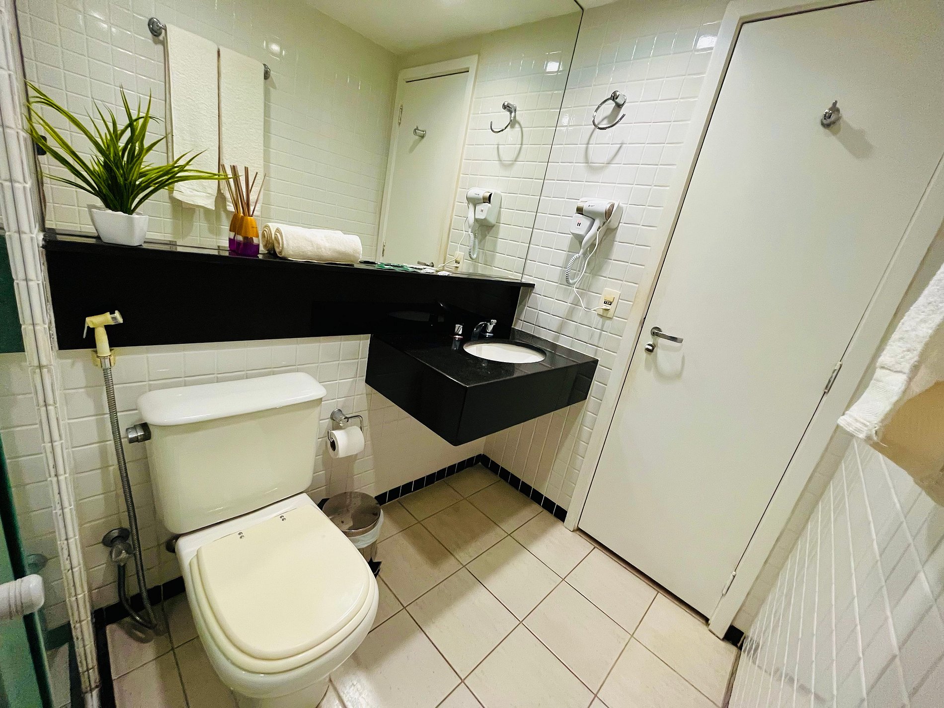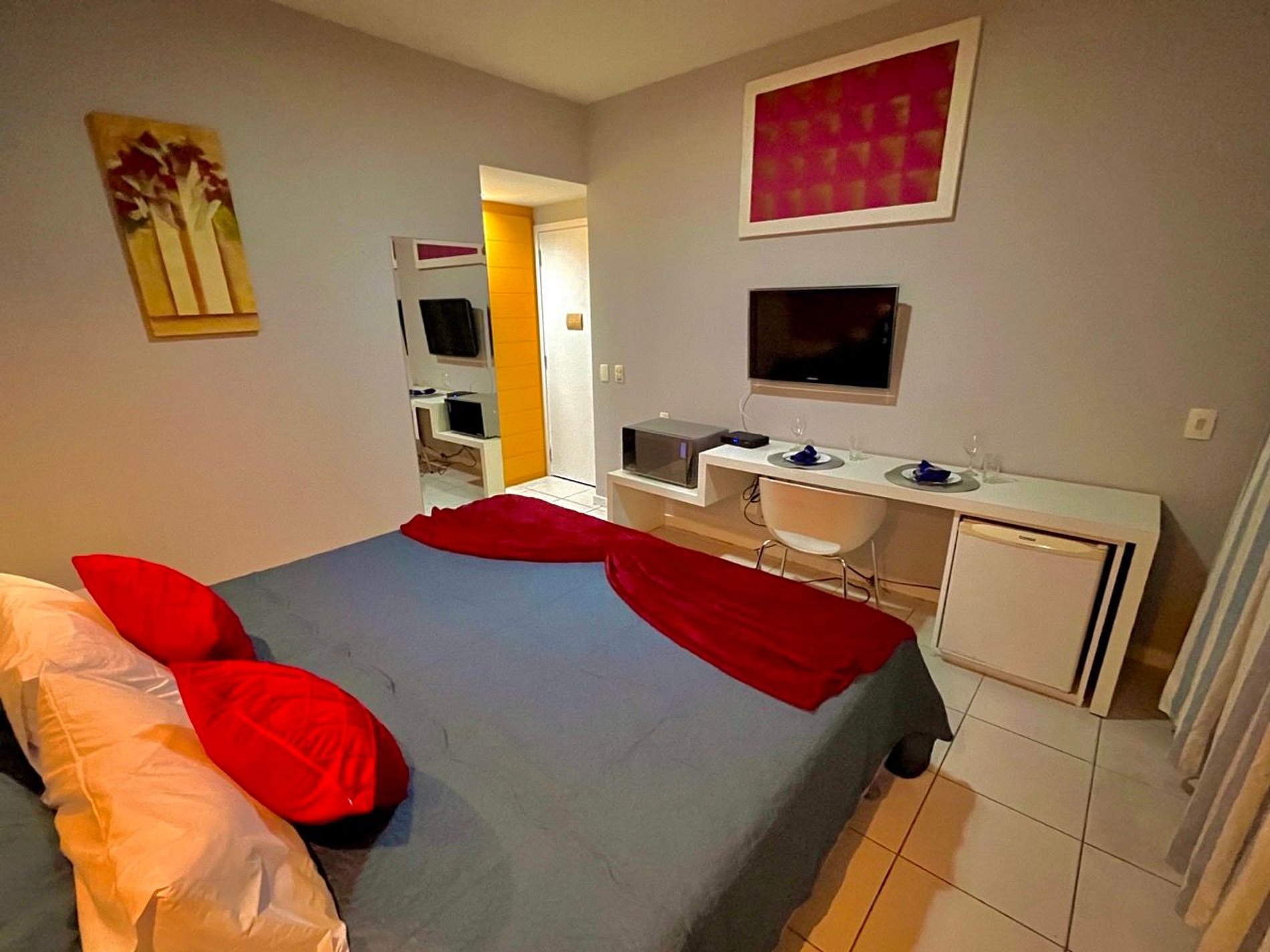 - No apartamento você terá ampla cama de casal King Size que pode se tornar 2 camas de solteiro conforme sua necessidade, com colchões extremamente confortáveis, TV Full HD 32" com TV a cabo, ar condicionado, Internet fibra ótica ultra veloz ( exclusiva do apartamento) frigobar, microondas, pratos, talheres, copos e taças, banheiro privativo e varanda com linda vista com 1 mesa e 2 cadeiras. - Serviço de arrumação do Apartamento em dias alternados.